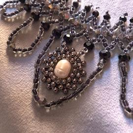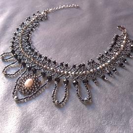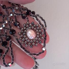 Questo girocollo artigianale in stile vintage gotico vittoriano è realizzato in Italia tramite la tecnica del bead weaving, che prevede l'intreccio manuale di elementi senza l'uso di colle. La struttura combina biconi in cristallo nero e grigio specchio con perle di vetro, mentre il dettaglio centrale presenta una perla di fiume naturale incastonata in rocailles di ottone. Il gioiello misura 32 cm con un'estensione di 7 cm. I materiali sono privi di nichel e sostanze tossiche, impiegando componenti certificati. Si tratta di un pezzo unico in edizione esclusiva, rifinito con una chiusura in ottone per garantire durata.