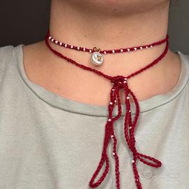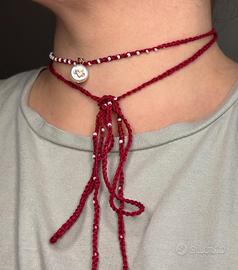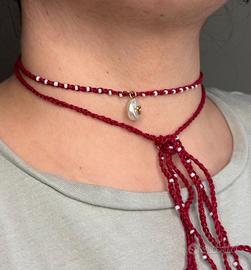 Collana fatta all'uncinetto con filato in cotone, con perline e charm con cuore