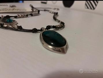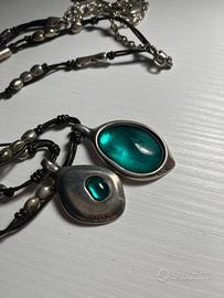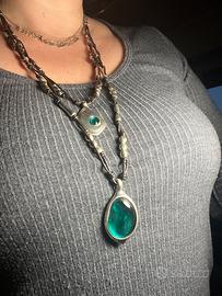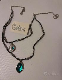 Collana A Doppia Lunghezza Da Donna Di Ciclon Della Collezione Infinite. Gioiello Realizzato In Zama Di Color Argento E Cuoio Con Pietre In Vetro Di Murano Color smeraldo. Chiusura Modello Tiffany. Gioiello Di 80 Cm Di Lunghezza. Questa collana verrà spedita con sacchetto Originale Ciclòn, condizioni perfette.