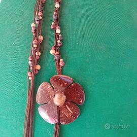 Collana /cintura in legno e cuoio,originale d'oriente , lunghezza totale cm 145, si può usare come collana o cintura.