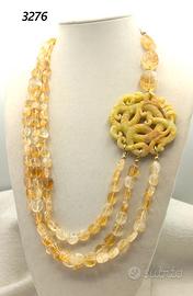 Dedicata alle amate clienti che osano, ma con eleganza e originalità , la collana importante e impegnativa , ecco questa calda proposta: tre fili del pregiato Citrino "Madeira" e Giada dorata incisa con il Serpente Imperiale cinese, simbolo di buona fortuna . Cm.66 : Suggerito per personalizzare e illuminare ogni outfit della stagione corrente. Creazione assolutamente UNICA e non replicabile.