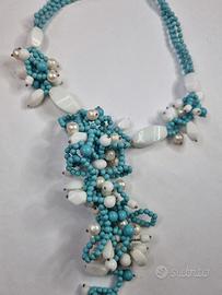 Design: Il collier presenta una cascata asimmetrica di perle che pende sul davanti. I fili di perline turchesi si uniscono a un'estremità con una chiusura a moschettone in metallo argentato.