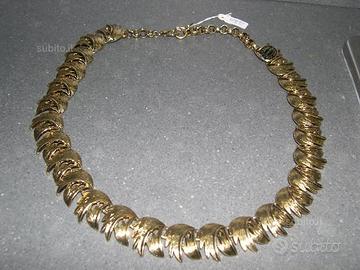 Stupendo e importante girocollo collana collier vintage, bigiotteria anni 70, con motivo a foglie sovrapposte, placcato oro 24 karati, chiusura a moschettone con catenella terminale regolabile, lunghezza totale del girocollo cm. 46,5, H delle foglie cm 2. Il girocollo è di buon peso, gr. 70, lavorato con la tecnica e la cura del passato, non avrete la sventura di piegarlo con due dita. Condizioni ottime pari al nuovo. Scatoletta inclusa. Svendo per inutilizzo. Consegna a mano. Vendita visto e piaciuto.