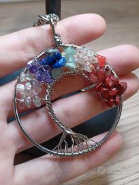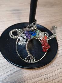 Collana con ciondolo a forma di albero della vita, decorato con pietre dure colorate: quarzo fantasma, ametista, lapislazzulo, acquamarina, citrino, agata e corallo.