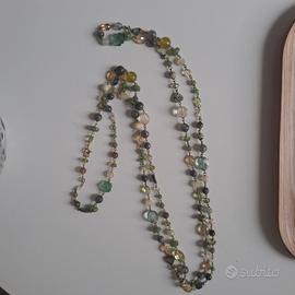 Collana fatta a mano con filo d'argento dorato con pietre dure: citrine, turchese verde, madreperla, agata, labradorite, fluorite, giada verde. Pezzo unico. Lunghezza 132 cm