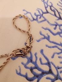 Splendida collana con pendente a forma di croce impreziosita da punti luce (pietre incastonate). Il design è classico ed elegante, perfetto sia per un uso quotidiano che per occasioni speciali. La catenina presenta una raffinata lavorazione a fune (torsion) che dona brillantezza e movimento al gioiello. Dettagli principali: Soggetto: Croce con pietre brillanti. Tipo di catenina: Maglia a fune/cordoncino. Colore: Argento/