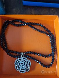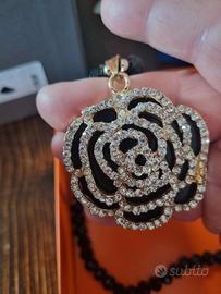 Bellissima collana con ciondolo a forma di rosa brillantinata da piccoli zirconi bianchi.