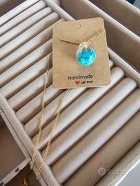 Collana in acciaio inossidabile color oro, con ciondolo a sfera contenente scintillanti stelline azzurre.