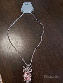 Collana con ciondolo gufo rosa, simil swarovsky.
