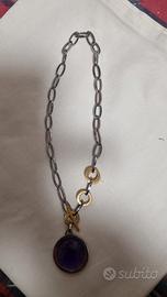 collana dorata ed argento, il ciondolo molto bello color viola scuro. molto bella la vendo perché ne ho due uguslissime una acquistata da me l altra mi è stata regalato perché avevo persa quella acquistata da me, come si dice casa nasconde non ruba ed io dopo un po di tempo e sbucato fuori. io lho pagata 280 euro