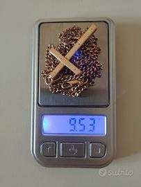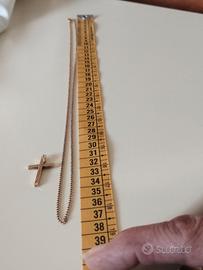 antico oro 10k, che rispetto al 18k è più duro e resistente ai graffi e di colore più chiaro,lunga collana con pendente croce con particolare lavorazione. peso e lunghezza in foto.