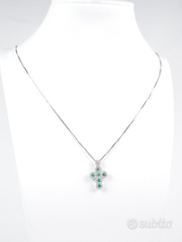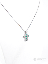 Collana con croce magic in oro 750 18kt con smeraldi di massa complessiva stimata 0.24ct e diamanti di massa complessiva stimata 0.28ct, colore e purezza stimate G-VS.