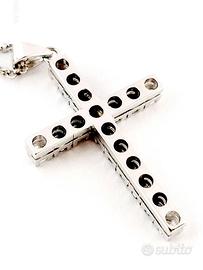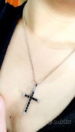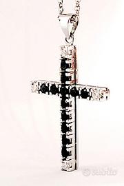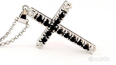 Collana con ciondolo pendente a forma di croce lavorata in Oro bianco 18kt-750 8kt con Diamanti Neri 1,07 e Diamanti bianchi naturali taglio brillante ct 0,25- Grammi 7,33