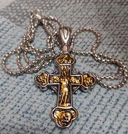Collana con Crocifisso in Argento 925 ottimo prodotto di qualità placcato oro 18 carati in alcune parti dell' oggetto sacro misure 4 x 8 x 1 cm di spessore circa