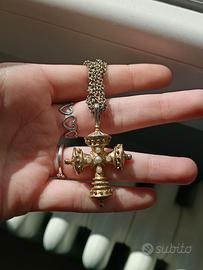 Vendo raffinato ciondolo a forma di croce in stile neobizantino/etrusco, caratterizzato da una complessa lavorazione a granulazione e decorato con perle centrali. Il gioiello si ispira ai preziosi reperti antichi (stile "Grand Tour") ed è un pezzo di alta bigiotteria vintage di grande impatto visivo e ottima fattura. Lavorazione ricca di dettagli con finitura dorata antica Condizioni: Ottime, come da foto. La doratura è ben conservata.