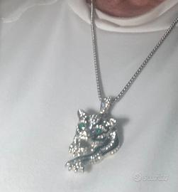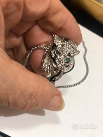 Bellissima collana co catena in acciaio di 60 cm. Pendente con figura di Giaguaro tempestato di gemme bianche taglio brillante e occhi 2 pietre smeraldo peso 24 Gm. Bellissimo x feste, x regalo o x altro!!e' nuovo mai indossato ma di molto effetto!'accetto proposte serie!!!