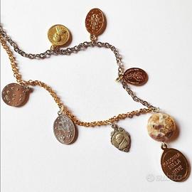 Collana vintage composta da una catenina dorata e argentata bicolore con pietra granitica dai toni oro e lilla e medaglie sacre votive. Ritraggono santi, papi, eventi religiosi e miracoli: qui in particolare c'è la Madonna della Neve, la Madonna con il bambino, Gesù Cristo, San Pietro e due medaglie Miracolose con la Vergine Maria (1830).