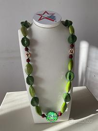 Collana Originale in esemplare unico con medaglione Dipinto a Mano del viso di " Dagda " la divinità che rappresenta la Natura nella mitologia Celtica. Il medaglione ha due differenti espressioni e può ruotare per manifestare l'umore di chi indossa la collana. Il medaglione è stato dipinto dall'artista Americana Laura Gail Sweeney e sulla collana è presente il marchio Gael Glass della Stella che l'artista usa per le opere realizzate in Mixed Media (Tecnica Mista ). Infilatura a Nodini con robusto filo in Poliestere .