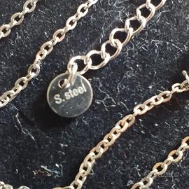Collana con nome da Donna in acciaio inossidabile, in perfette condizioni, pari al nuovo. Linea acciaio S.Steel. Collana a maglie sottili, con lunghezza di 55 cm. Nome donna "Francesca".