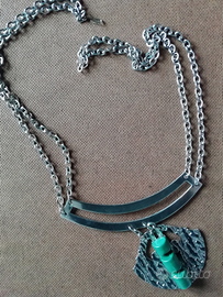 Collana in metallo color argento con pendente con tre pietre di malachite. La malachite viene utilizzata in gioielleria per il suo aspetto molto particolare. E' una pietra verde dai colori e le tonalità bellissime. Si dice che per chi la indossa tenga lontano le entità negative.
