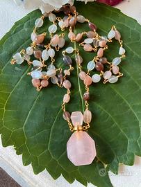 Collana pietre dure naturali lunga 1.20 cm con portaprofumo in quarzo rosa Realizzato su ordinazione pezzo unico