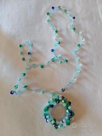 Gioiello tessile eseguito a mano mai utilizzato. Collana circonferenza 64cm, prendente diametro 4cm. Perline multicolori di vetro. Scatola contenitore compresa nel prezzo.