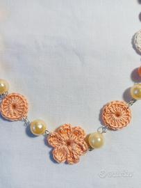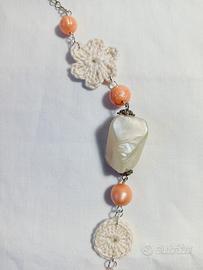 Realizzata con perle color panna e salmone abbinate con fiori all' uncinetto.