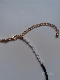 Mai indossata. Ha delle perline bianche e nere separate da una perlina oro. La lunghezza dal gancio alla chiusura è di 46 cm.