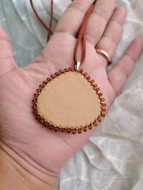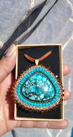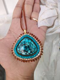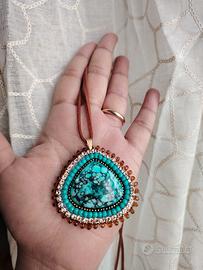 Collana artigianale con una pietra centrale di turchese, incastonata con perline. - Pietra centrale di turchese. - Cornice di perline turchesi e ambrate. - Cordino in pelle scamosciata marrone. - Chiusura dorata.