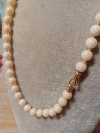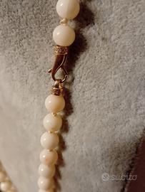 Collana corallo secundum bianco rosato cm 50 con sfere della grandezza di 8 mm lunga cm 50. La chiusura è in metallo dorato o forse argento .