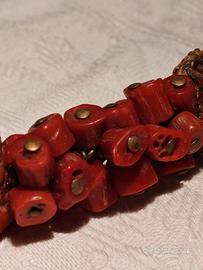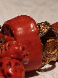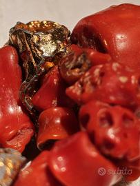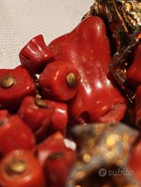 Importante collana artigianale vintage 1965-1980 in corallo rosso mediterraneo _Corallium rubrum_ naturale. Pezzo da collezione. *Misure importanti:* - Lunghezza totale: 54 cm - Peso totale: 85 grammi - Centrale: pezzo unico 2 cm di diametro, colore rosso moro intenso Lavorazione a grappolo con rametti su chiodini in ottone e pepite in bronzo dorato. Terminali a barilotti scalari. Corallo naturale di prima scelta, ottima lucidatura. Stima corallo netto 55-60g. *DA RESTAURARE*: Venduta da rinfilare perché la chiusura è rotta. Filo da sostituire. Tutti i pezzi di corallo integri e completi, compreso il centrale da 2 cm. Con restauro da 50€ torna una collana da oltre 450€. Perfetta per orafi, artigiani o collezionisti. "Corallo mediterraneo naturale. Gioiello vintage italiano anni 70, pre-convenzione CITES. Vendita tra privati in Italia." #corallorosso #torredelgreco #corallomediterraneo #85grammi #54cm #centrale2cm #darestaurare #vintageanni70