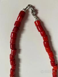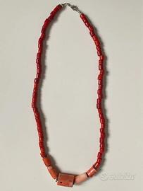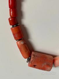 Collana vintage fatta a mano con al centro 2 tronchetti piccoli + 2 medi + 1 grande in corallo color salmone con separatori argento a stellina + 66 perline tubolari in corallo bambù rosso liscio, montati su doppio filo, con chiusura a moschettone. Lunghezza cm. 64.