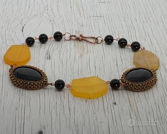 Materiali: cabochon ovali di agata nera da 4 per 3 cm, pietre dure piatte di agata gialla da 4 per 3 cm, perline bronzo di vetro, perle da 12 mm di onice nera, filo di metallo ramato, gancio da 35 mm.