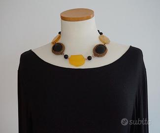 Scopri questa collana speciale, corta, girocollo, un gioiello bohemian che cattura l'attenzione con il suo design vistoso e particolare. Realizzata a mano, questa collana unisce grandi pietre piatte di agata nere e gialle, creando un contrasto affascinante.