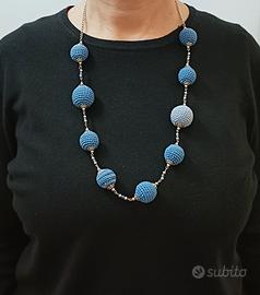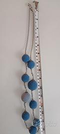 Collana artigianale realizzata con sfere in cotone blu e catena in acciaio.