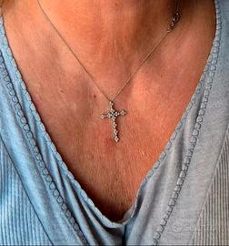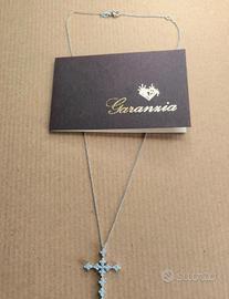 Collana con croce in oro bianco 750/1000, diamanti taglio brillante naturali bianchi. Si vende con certificato di autenticità di garanzia del negozio di vendita. La catenina ha 3 livelli di aggancio per la lunghezza, tramite anellini. Lunghezza totale, 46.5 cm totali.