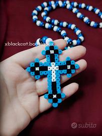 🖤 Collana in stile rosario con croce in pixel art blu, bianca e nera