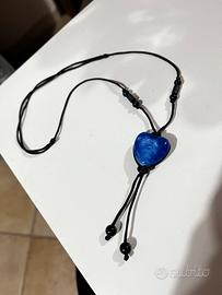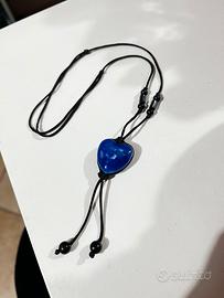 Collana con cordino nero regolabile e pendente a forma di cuore in pietra blu effetto marmorizzato. Design semplice ma d’effetto, impreziosito da perline nere lungo il cordino e ai finali. Chiusura scorrevole che permette di adattare facilmente la lunghezza che va da 48cm fino ai 68cm. Indossata 1-2 volte, in ottime condizioni. Ideale per un look casual o boho, perfetta da indossare tutti i giorni o come idea regalo. 💙