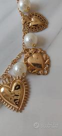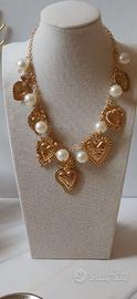 Collana sacro cuore punk in maglia rolo' zinco oro rose e cuori sacri ex voto, grandi perle acriliche craquele' Catena a maglia con chiusura regolabile ed estensione di 5 cm.