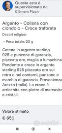 Questa bellissima collana è molto antica, si tramanda in famiglia da generazioni. Tutta in argento placcato oro con punzuni di garanzia. La croce traforata è a dir poco stupenda, impreziosita da ametista. La collana è stata stimata 650€ dagli specialisti di un noto sito D'Aste dove poi però non ho voluto fare partecipare.