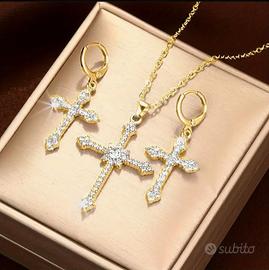 set di 3 pezzi di collana con crocifisso e 1 catena,colore giallo d'orato,bigiotteria ottima qualità nuovo sigillato
