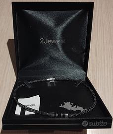 Collana di colore nero, caratterizzata da una chiusura magnetica e da perline tubolari decorative in metallo argentato.
