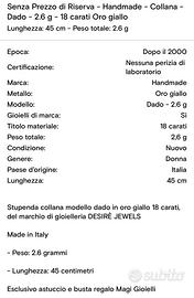 Handmade - Collana - Dado - 2.6 g - 18 carati Oro giallo. Nuova nella sua confezione 45cm Donna Confezionato #18k #donna #collanaoro