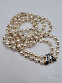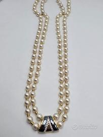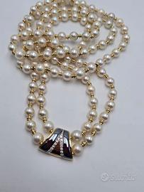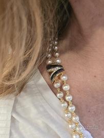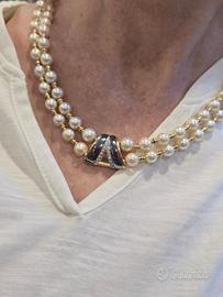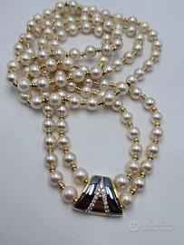 Splendida collana a filo doppio Damiani in oro giallo massiccio 18 carati con 122 perle Akoya di 9 millimetri di diametro e con bellissima chiusura a V con 17 diamanti taglio brillante e ematite.