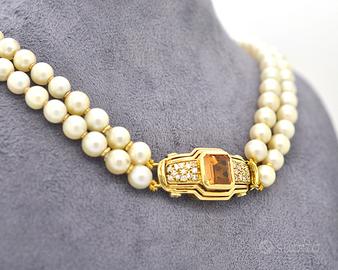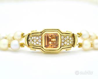 Chiusura in oro giallo Kt 14, con quarzo citrino centrale e pavé di diamanti laterali Ct 1,20, colore G, purezza VS.