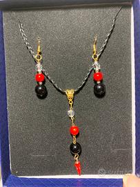 Collana realizzata artigianalmente con cordino intrecciato a mano in similpelle, perle rosse dette laser , perle nere in pietra naturale e piccoli cristalli swarovski