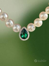 Set composto da collana di perle con pendente verde smeraldo e orecchini coordinati, dal fascino vintage con influenze Y2K, perfetto per chi ama gioielli eleganti ma distintivi. Un abbinamento senza tempo che unisce raffinatezza e personalità, ideale per valorizzare ogni look con un tocco di colore prezioso.