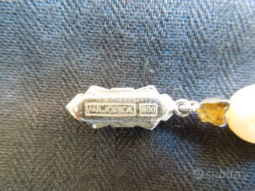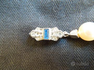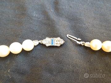 Cedo una splendida collana "vintage" in vere perle di Maiorca annodate una ad una completa di chiusura in argento 800 con brillanti e zaffiro. Diametro medio delle perle 7,5 mm. Splendido colore delle perle mantenuto per l'originalità ed il poco uso fatto del gioiello.