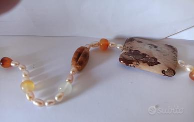 Collana composta da perle coltivate nell’ostrica di acqua dolce di colore naturale e forma ovale di diametro circa 4,5 mm. Agata dendritica maculata naturale a taglio rettangolare diametro circa 30x40 mm ,agata multicolor naturale taglio a mela diametro circa 8 mm e agata color biscotto naturale taglio inciso diametro circa 10 mm .