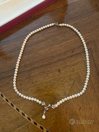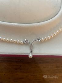 Vendo elegante collana composta da perle naturali coltivate da 4,5 mm, con centrale in oro bianco 18 kt (750/1000) lavorato a mano e impreziosito da un brillante da 0,03 ct.